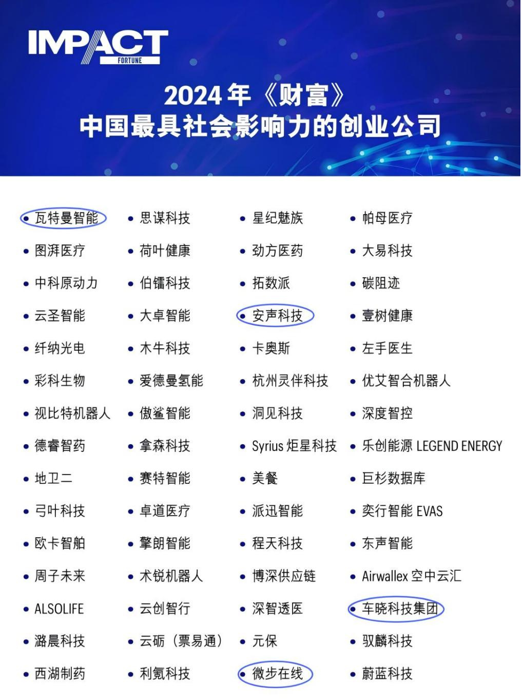 近日,全球著名商業雜志《財富》(Fortune Magazine)發布“2024年中國最具社會影響力的創業公司”榜單。創投集團4家被投企業成功上榜,包括:瓦特曼智能、安聲科技、微步在線和車曉科技。 (一)北京瓦特曼智能科技有限公司